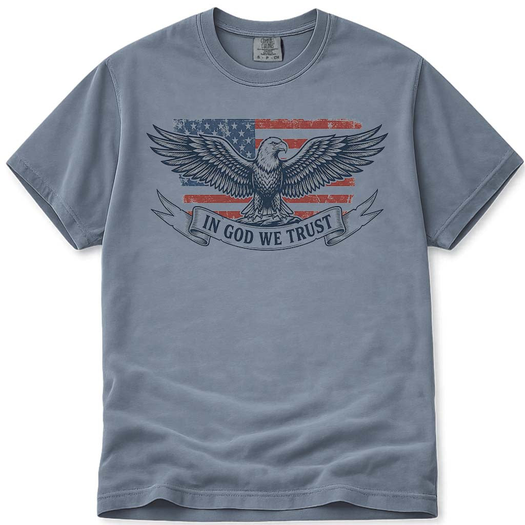 Printed on a Comfort Colors tee with that heavyweight, garment-dyed softness you feel from the first wear. If the eagle-and-flag look speaks to you, our Freedom Eagle tee carries the same spirit. The "In God We Trust" motto hits a chord that never gets old, and our Flag Eagle design makes a solid companion.