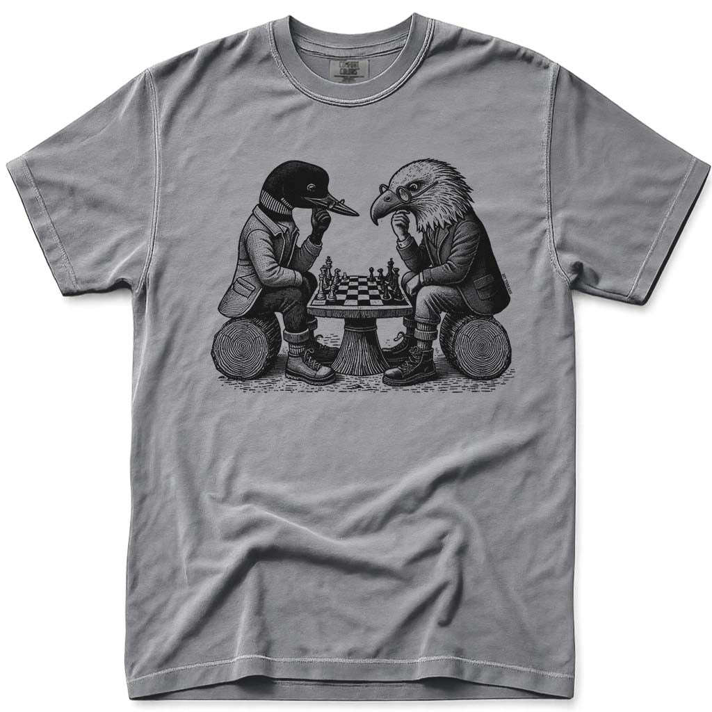 Two of the most iconic birds in North America, sitting across from each other at the chessboard. The loon plays with patience. The eagle plays with aggression. You already know who you're rooting for. This design brings together wildlife and strategy in a way that only works on a t-shirt, and it's one of the more unique pieces in our animal shirts collection.